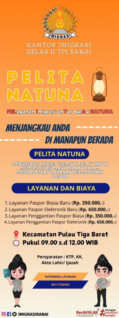 Pelita Natuna adalah program layanan imigrasi yang dirancang untuk memudahkan masyarakat di wilayah Natuna dalam mengakses layanan pembuatan paspor. Dengan program ini, masyarakat tidak perlu lagi jauh-jauh ke kantor imigrasi untuk mengurus dokumen perjalanan penting ini.